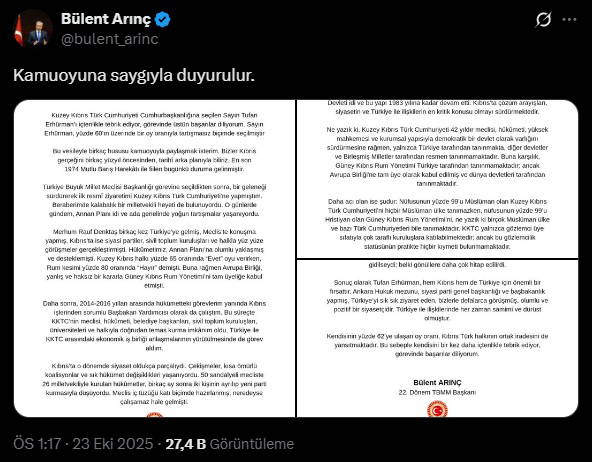 AKP’li Bülent Arınç, partisinin KKTC Cumhurbaşkanlığı Seçimleri’nde takındığı tavra tepki gösterdi. Arınç, Tufan Erhürman’ı seçim zaferi nedeniyle tebrik etti.