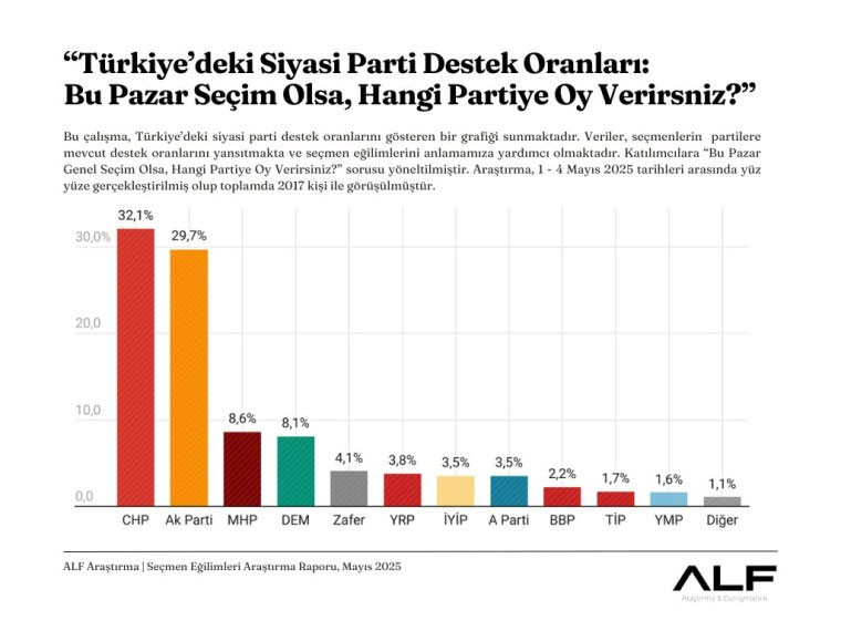 Bunlarla beraber araştırma şirketleri ise seçim anketlerinin sonuçlarını yayımlamayı sürdürüyor. ALF Araştırma 1-4 Mayıs 2025 tarihleri arasında 2017 kişi ile yüz yüze gerçekleştirilen anket çalışmasının sonucunu açıkladı.