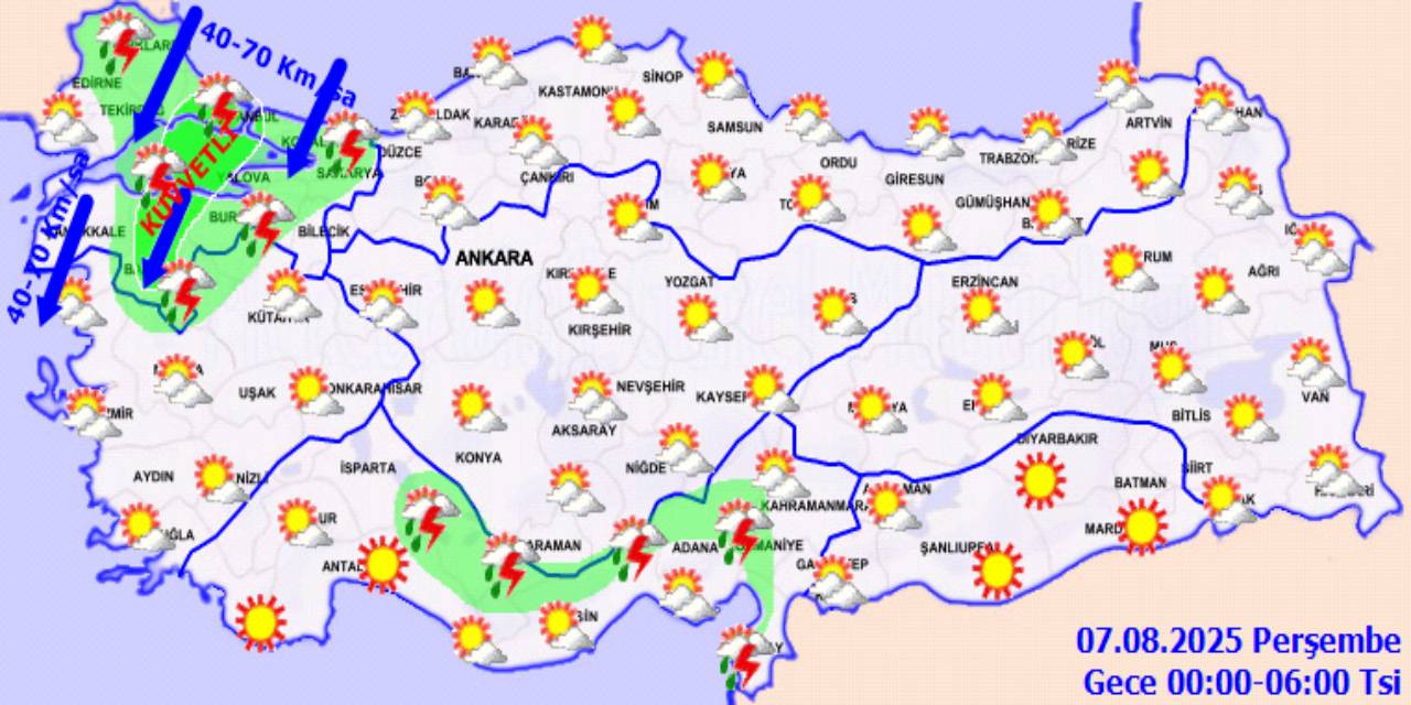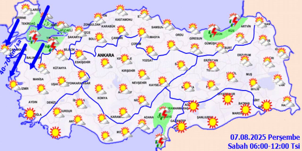 Ülkemizin kuzey kesimlerinin parçalı, yer yer çok bulutlu, (Bilecik ve Çanakkale hariç) Marmara, Ege’nin iç kesimlerinin kuzey ve güneydoğusu, (Samsun hariç) Orta ve Doğu Karadeniz kıyıları ile Gümüşhane çevreleri ve Doğu Anadolu’nun kuzeydoğusu ile Van’ın doğusu ve İskenderun Körfezi çevrelerinin yerel sağanak ve gök gürültülü sağanak yağışlı, diğer yerlerin az bulutlu ve açık geçeceği tahmin ediliyor. Bu akşam ve gece saatlerinde beklenen yağışların İstanbul ve Balıkesir çevrelerinde yerel kuvvetli olması bekleniyor.