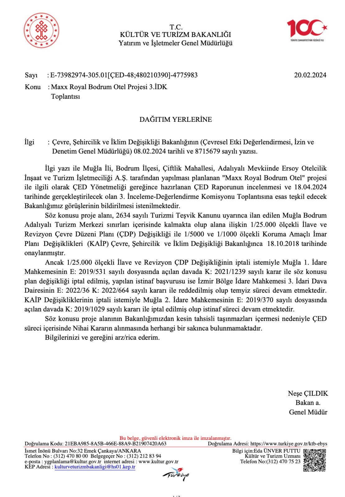 Gazete Duvar‘dan Bahadır Özgür‘ün haberine göre; Grand Kartal Oteli’ndeki 78 yurttaşın yaşamını yitirdiği yangın sonrası hiçbir sorumluluğu kabul etmeyen Turizm Bakanı Mehmet Nuri Ersoy’un, ormanlık alana kuracağı Maxx Royal Bodrum için izin belgesinin altındaki imza tanıdık çıktı. Daha önce ETS Tur’da yatırım danışmanlığı yapan, şu an Turizm Bakanlığı Yatırım ve İşletmeler Genel Müdürlüğü koltuğunda oturan Neşe Çıldık’ın, Mehmet Nuri Ersoy adına Bakan Ersoy’a izin verdiği ortaya çıktı.