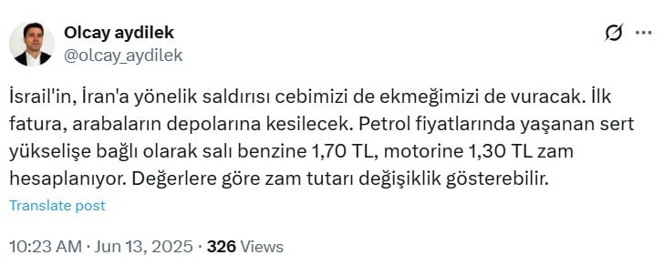 İsrail’in İran’a yönelik hava saldırılarının ardından petrol fiyatlarında sert yükselişler yaşandı. Brent petrol, 77 dolar seviyelerine kadar çıkarak son dönemin en yüksek seviyelerine ulaştı. Bu gelişmelerin ardından akaryakıt fiyatlarına zam …