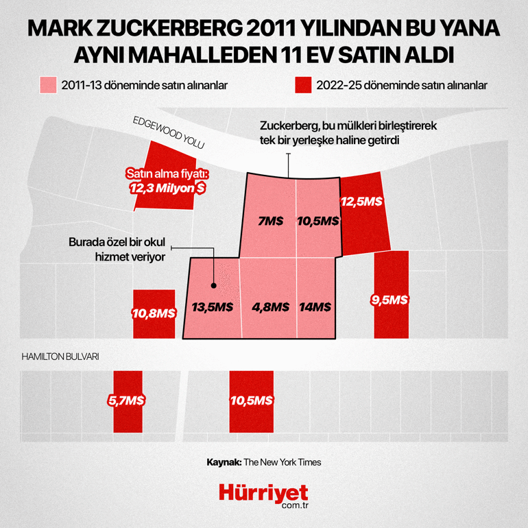 Zuckerberg’ün emlak yatırımları oldukça meşhur. Daha önce San Francisco’nun Dolores Park mahallesinde de benzer bir inşaatla tepkilerin hedefi olan Facebook kurucusu, burayı 2022’de 31 milyon dolara satmıştı. Zuckerberg Hawaii’nin Kauai adasında çok geniş bir arazinin üzerinde de bir yerleşke inşa ediyor. Burada iki malikane, ip köprülerle birbirine bağlı ağaç evler ve bir yeraltı sığınağı bulunuyor. Teknoloji milyarderinin inşa ettiği üçüncü yerleşke Tahoe Gölü yakınlarında bulunuyor. Zuckerberg ayrıca bu yıl Washington D.C.’de bulunan dev bir malikaneye de 23 milyon dolar nakit ödemişti.