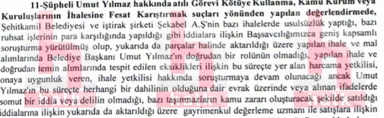Yılmaz henüz CHP’deyken yapılan bu suç duyurusu, aylardır savcılığın önünde bekliyordu. Gaziantep Cumhuriyet Başsavcılığı, Yılmaz CHP’den istifa ettikten sonra AKP İlçe Başkanı İsmail Güler’in şikayetiyle ilgili kararını verdi. Savcılık, Yılmaz hakkında ‘kovuşturmaya yer olmadığına’ karar verdi. Savcılığın verdiği kararın gerekçeleri arasında, ‘ihale ve mal alımlarında Belediye Başkanı Umut Yılmaz’ın doğrudan bir rolünün olmadığı, yapılan ihale ve doğrudan temin alımlarında eksikliklerin tespit edildiği ancak Yılmaz’ın herhangi bir dahlinin olmadığı’ ifadeleri yer aldı.