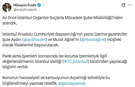 “Az önce İstanbul Organize Suçlarla Mücadele Şube Müdürlüğü’nden arandık. İstanbul Anadolu Cumhuriyet Başsavcılığı’nın yazısı üzerine gazeteciler Şule Aydın ve Murat Ağırel’in müşteki olarak ifadelerine başvurulacak. İfade alma işlemleri sonrasında ise koruma işlemleriyle ilgili değerlendirmenin İstanbul Valiliği tarafından yapılacağı bilgisini verildi. Konunun hassasiyeti ve kamuoyunun duyarlılığı sebebiyle bu bilgilendirmeyi yapmak istedik.”