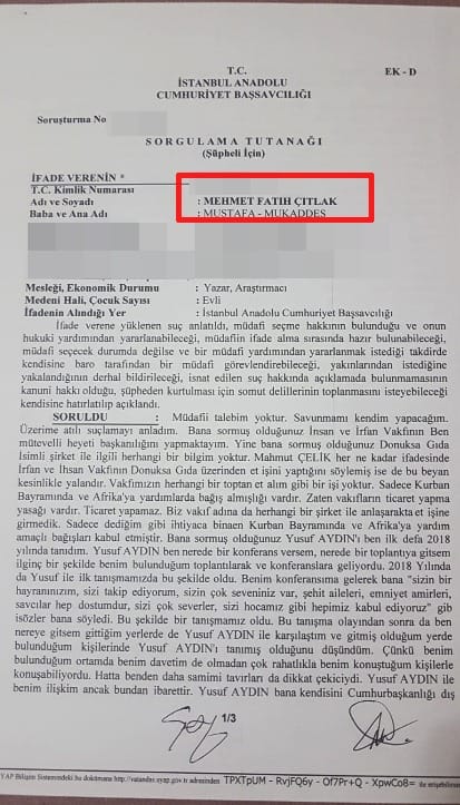 Mahmut Çelik’in başvurusu üzerine başlatılan soruşturma kapsamında İnsan ve İrfan Vakfı Mütevelli Heyeti Başkanı M. Fatih Çıtlak’ın da ifadesi alındı. Çıtlak, şüpheli sıfatıyla verdiği ifadesinde Yusuf Aydın’a ilişkin dikkat çeken ifadeler kullandı: “Yusuf Aydın, ben nerede bir konferans versem, nerede bir toplantıya gitsem benim bulunduğum toplantı ve konferanslara geliyordu. 2018’de ilk tanışmamızda bu şekilde oldu. Konferansıma gelerek bana ‘Sizin hayranınızım. Sizin çok seveniniz var. Şehit aileleri, emniyet amirleri, savcılar hep dostumdur. Sizi hocamız gibi kabul ediyoruz’ gibi sözler bana söyledi” dedi.
