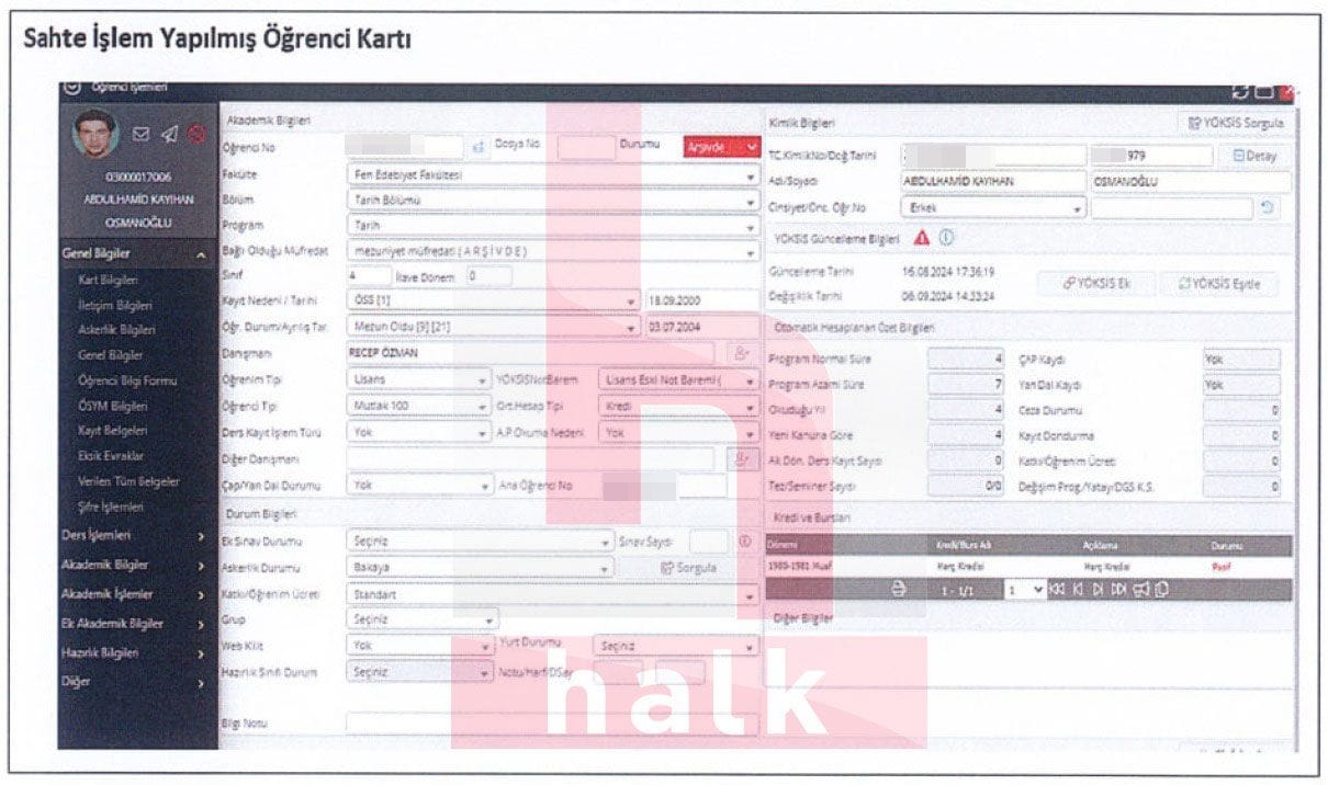 Adına sahte diploma çıkarılan 57 kişi arasında Abdülhamid Kayıhan Osmanoğlu’nun da yer aldığı ortaya çıkmıştı. Kayıtlara göre Osmanoğlu, Malatya’da bulunan İnönü Üniversitesi’nde ‘Tarih” bölümünde mezun olmuş gibi gösterildi. Osmanoğlu adına çıkarılan sahte diploma YÖK sistemine yüklendi. Osmanoğlu adına çıkarılan diplomanın tarihi ise 16 Ağustos 2024. Anılan gün saat 17.20’de sahte diploma sisteme yüklendi. Osmanoğlu ise sahte diplomanın sisteme yüklenmesinden 29 dakika sonra e-devlete girerek mezuniyet durum sorgusu yaptı. Osmanoğlu’nun aynı sorguyu toplamda 21 kez yaptığı anlaşıldı.