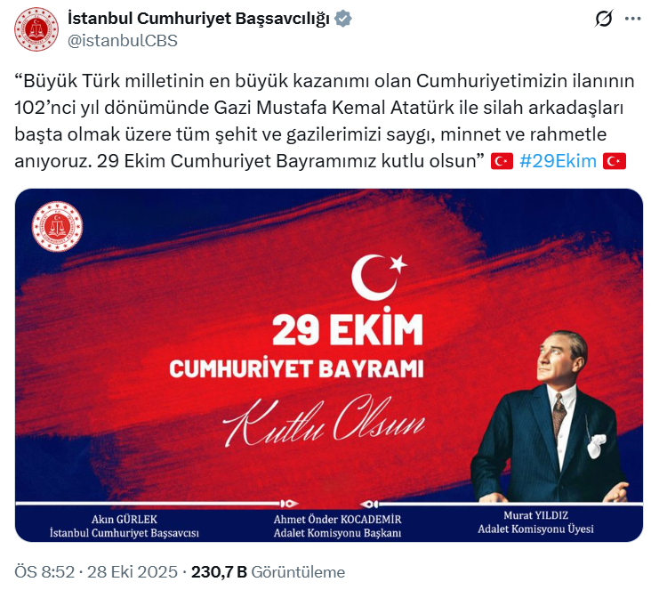 Ekim 2025’te açılan ‘İstanbulCBS’ adlı hesaptan yapılan ilk paylaşımda 29 Ekim Cumhuriyet Bayramı mesajı yer aldı.