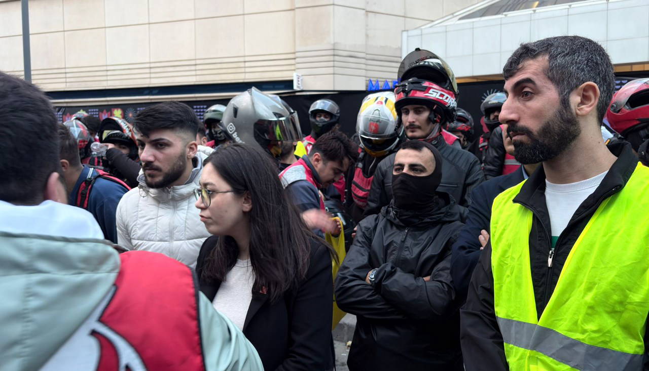 Ofis önünde toplanan kuryeler, taşıdıkları döviz ve pankartlarla eylemlerini burada sürdürdü.