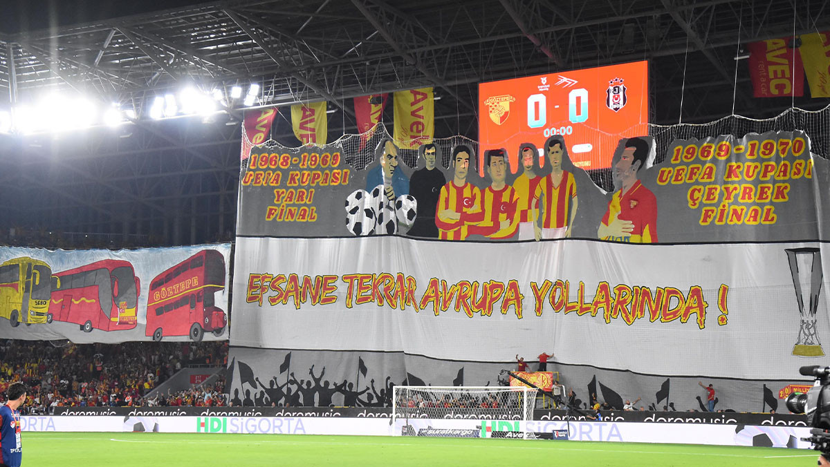 Gürsel Aksel Stadı’nda biletleri günler öncesinden tüketen sarı-kırmızılılar tribünleri tıklım tıklım doldurdu. Göztepeliler her iki kale arkasında da koreografi gösterileri yaptı. “Efsane Tekrar Avrupa Yollarında” pankartı açan renkli görüntüler oluşturdu. Beşiktaşlı taraftarlar da kendilerine ayrılan deplasman tribünü tamamen doldurdu.