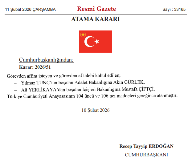 11 Şubat 2026 tarihli ve 33165 sayılı Resmî Gazete’de yayımlanan Cumhurbaşkanlığı kararıyla kabinede dikkat çeken değişiklikler yapıldı.