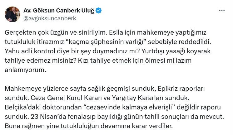 “Gerçekten çok üzgün ve sinirliyim. Esila için mahkemeye yaptığımız tutukluluk itirazımız “kaçma şüphesinin varlığı” sebebiyle reddedildi. Yahu adli kontrol diye bir şey duymadınız mı? Yurtdışı yasağı koyarak tahliye edemez misiniz? Kızı tahliye etmek için ölmesi mi lazım anlamıyorum.