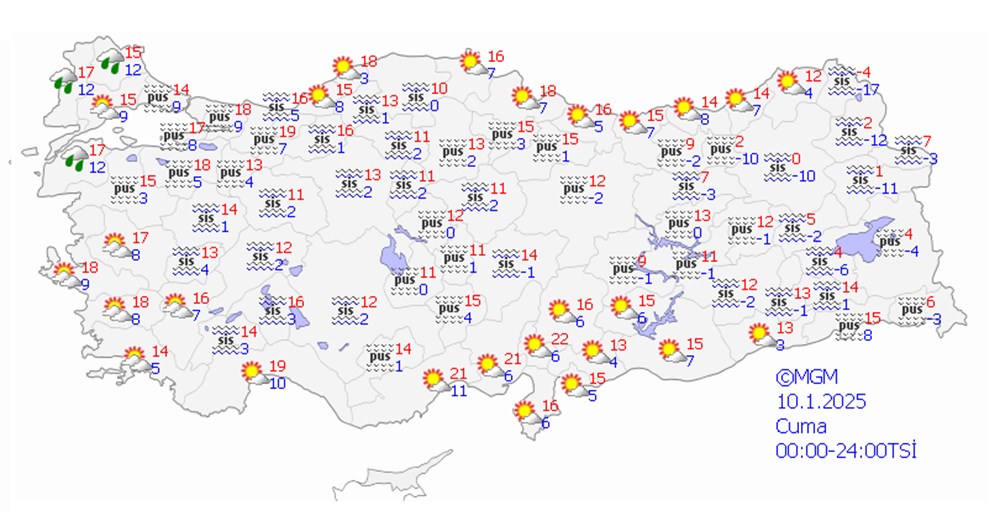Yurdun iç ve doğu kesimlerinde buzlanma ve don ile birlikte pus ve yer yer sis hadisesi bekleniyor.