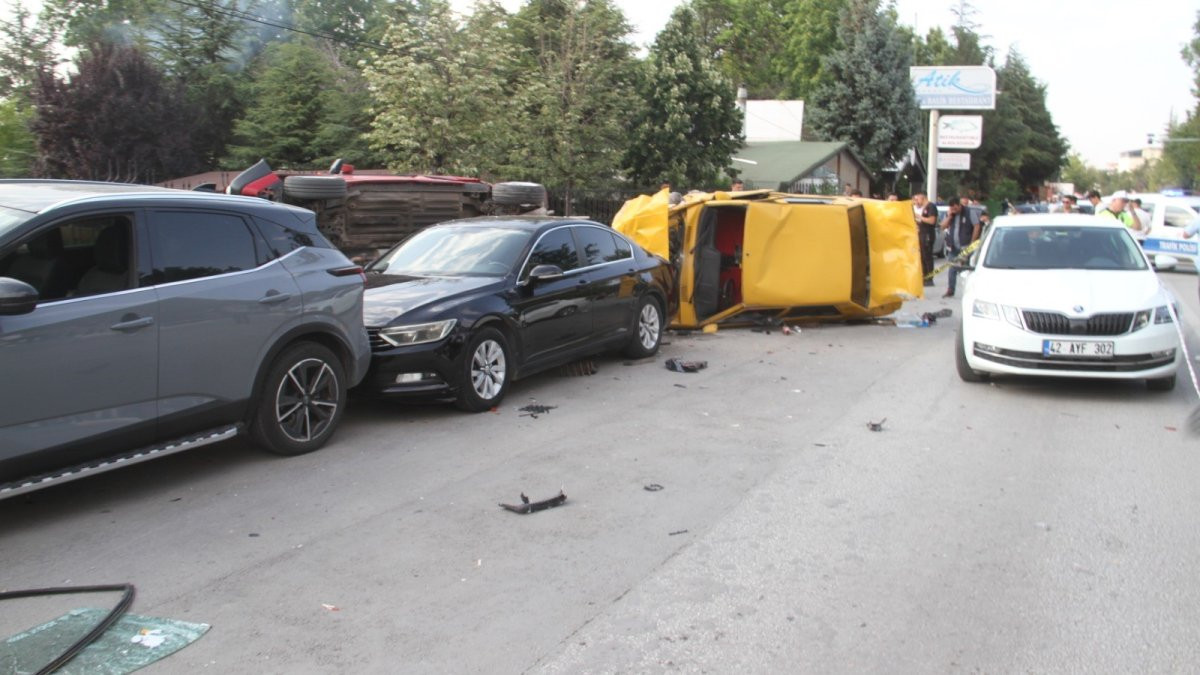 Konya’nın Beyşehir ilçesinde, şehrin en işlek caddesinde makas atarak seyreden otomobil, trafik lambalarında kırmızı ışıkta bekleyen bir araç ile park halindeki otomobillere çarptı, ortalık adeta savaş alanına dönerken 6 araçlı kazada 3 kişi yaralandı.