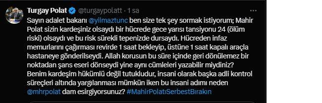 “Sayın adalet bakanı @yilmaztunc ben size tek şey sormak istiyorum; Mahir Polat sizin kardeşiniz olsaydı bir hücrede gece yarısı tansiyonu 24 (ölüm riski) olsaydı ve bu risk sürekli tepenizde dursaydı. Hücreden infaz memurlarını çağırması revirde 1 saat bekleyip, üstüne 1 saat kapalı araçla hastaneye gönderilseydi. Allah korusun bu süre içinde geri dönülemez bir noktadan şans eseri dönseydi yine aynı cümleleri yazabilir miydiniz?
