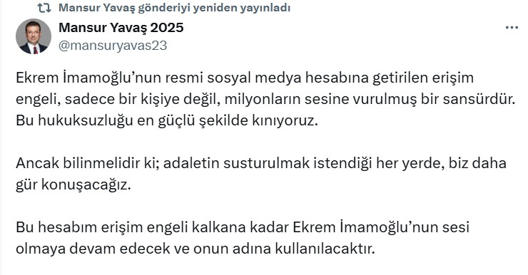 Tutukluluğu boyunca, kamuoyuna mesajlarını X üzerinden ulaştırmayı sürdüren İmamoğlu’nun hesabına gece saat 02.00 sıralarında Türkiye’den erişim engellendi. Bu gelişme üzerine dikkat çeken bir adım, Ankara Büyükşehir Belediye Başkanı Mansur Yavaş’tan geldi. Yavaş, seçim döneminde kullandığı kampanya hesabını Ekrem İmamoğlu’nun kullanımına açtığını duyurdu. Dayanışma amacıyla hesabının profil fotoğrafını da İmamoğlu’nun fotoğrafıyla değiştirdi.