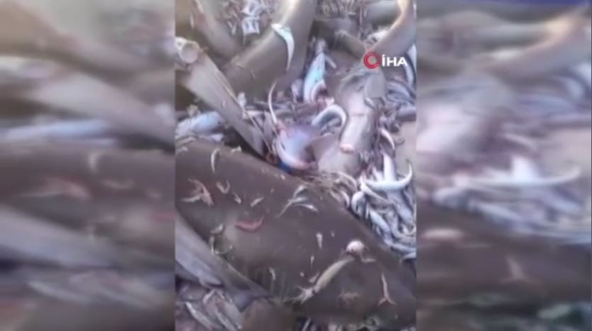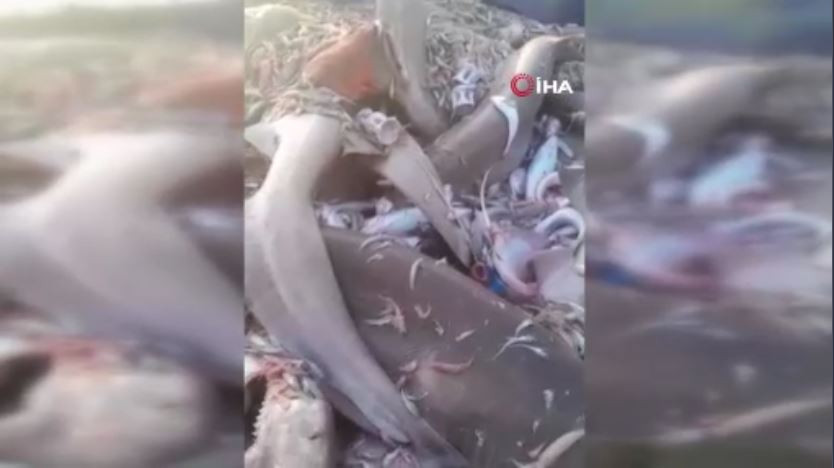 Görüntüleri çeken bir balıkçı, “Bu yıl kimse Akdeniz’e girmesin, bunlar insanı yer, düşmanlarımız girsin. Tarihte böyle bir şey gördünüz mü? 8 tane!” gibi ifadeler kullandı.