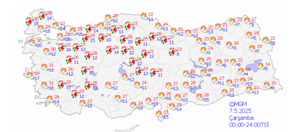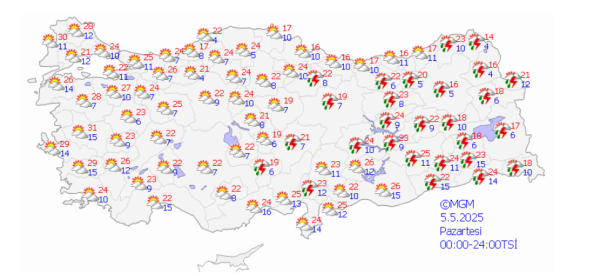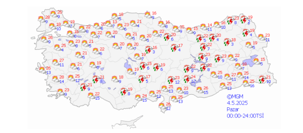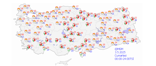 Meteoroloji Genel Müdürlüğü tarafından bugün için yapılan tahminde, ülkemiz genelinin parçalı yer yer çok bulutlu, Akdeniz, İç Anadolu’nun güney ve doğusu, Orta Karadeniz ile Muğla, Denizli, Afyonkarahisar, Giresun, Trabzon ve Hakkari çevrelerinin sağanak ve gök gürültülü sağanak yağışlı geçeceği belirtildi. Sabah ve gece saatlerinde kuzey, iç ve doğu kesimlerde pus ve yer yer sis hadisesi yaşanacak. Hava sıcaklıklarının yurt genelinde mevsim normalleri civarında seyredeceği aktarıldı.