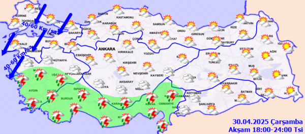 Parçalı ve çok bulutlu, Muğla, Aydın ve Denizli çevrelerinde yerel kuvvetli olmak üzere, bölgenin aralıklı sağanak ve gök gürültülü sağanak yağışlı geçeceği tahmin ediliyor. Rüzgârın, kuzey kıyılarında kuzey ve kuzeydoğu yönlerden kuvvetli ve kısa süreli fırtına (40-70 km/saat) şeklinde eseceği tahmin ediliyor.
