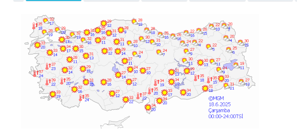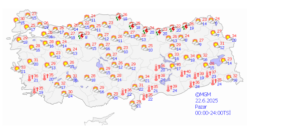 Meteoroloji Genel Müdürlüğü tarafından yapılan tahminlerde, ülkemizin kuzeydoğu kesimlerinin parçalı yer yer çok bulutlu; Giresun, Trabzon, Rize ve Artvin’in iç kesimlerinin yerel sağanak yağışlı, diğer yerlerin az bulutlu ve açık geçeceği aktarıldı. Hava sıcaklığının, yurdun kuzey ve doğu kesimlerinde mevsim normallerinin üstünde, diğer yerlerde mevsim normalleri civarında seyredeceği aktarıldı. Rüzgârın, Marmara’nın batısında kuvvetli olarak (30-50 km/saat) esmesi bekleniyor.
