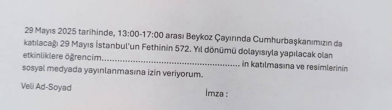 Öte yandan Beykoz’da bulunan Ayşe Eda Özdemir Ortaokulu’ndaki velilerden öğrencilerin programa katılması için izin istendi. Velilere, “29 Mayıs 2025 Perşembe günü “İstanbul’un Fethi”nin yıl dönümü kapsamında Beykoz çayırında düzenlenecek olan tören programına Cumhurbaşkanımız Sayın Recep Tayyip Erdoğan katılacaktır. Okulumuzun görevli olduğu bu programa öğrencimin katılmasını uygun görüyorum” yazılı izin istek kağıdı gönderildi.