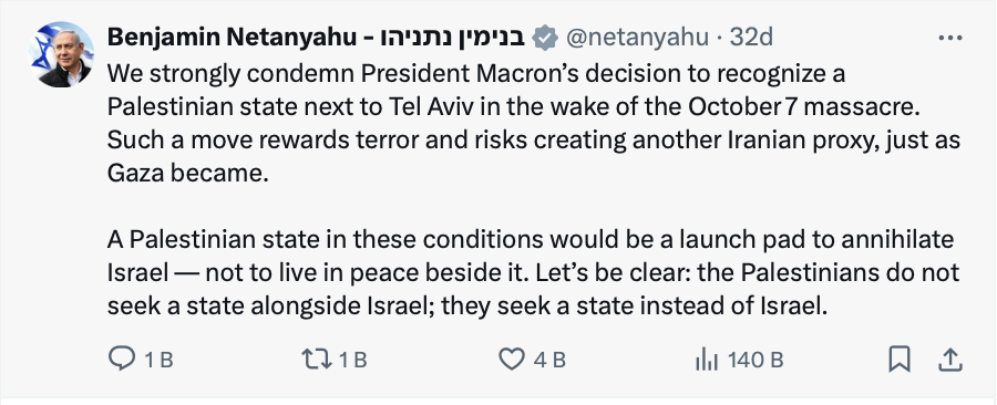 “Cumhurbaşkanı Macron’un 7 Ekim katliamının ardından Tel Aviv’in yanı başında bir Filistin devleti tanıma kararını şiddetle kınıyoruz. Böyle bir hamle, terörü besler ve tıpkı Gazze’de olduğu gibi, yeni bir İran vekili yaratma riskini taşır. Bu koşullarda bir Filistin devleti, İsrail’in yanında barış içinde yaşamak değil, onu yok etmek için bir fırlatma rampası olacaktır. Açık konuşalım: Filistinliler İsrail’in yanında bir devlet istemiyor; İsrail yerine bir devlet istiyorlar.”