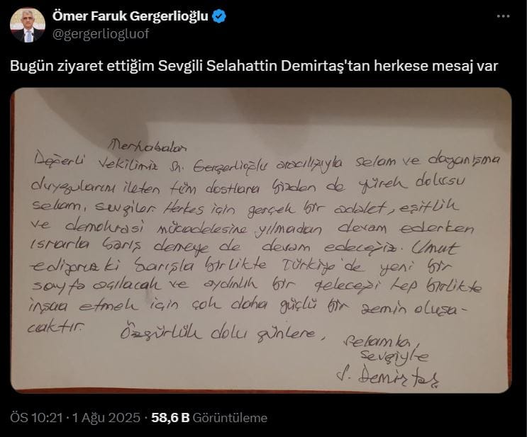 Ömer Faruk Gergerlioğlu, Altaylı’nın gündeme bomba gibi düşen iddialarının ardından “Bugün ziyaret ettiğim Sevgili Selahattin Demirtaş’tan herkese mesaj var” diyerek cezaevinden getirdiği notu paylaştı.