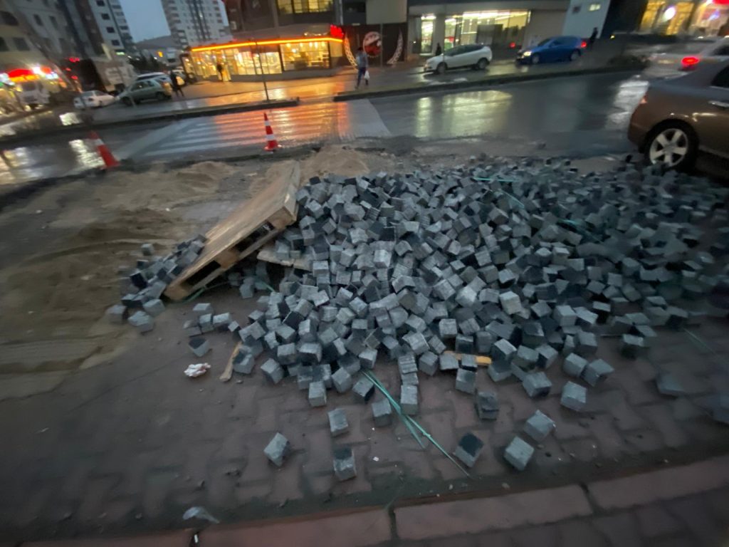 Cadde üzerinde sökülen kasis taşları yol ve kaldırım kenarlarında yığınlar halinde duruyor. Kum, moloz ve düzensiz yamalar nedeniyle yol daralırken, tek yönlü trafiğe rağmen sürücüler ani manevralar yapmak zorunda kalıyor. Bu durum özellikle yağışlı havalarda kayma ve maddi hasarlı kazalar riskini artırıyor.