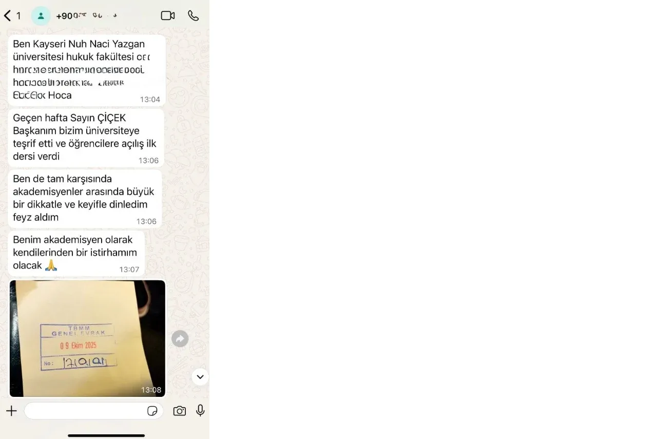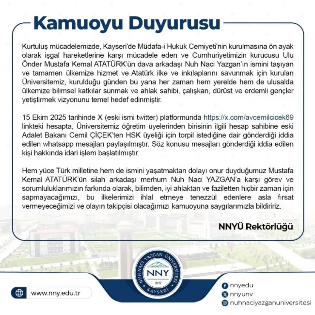 15 Ekim 2025 tarihinde X (eski ismi twitter) platformunda https://x.com/avcemilcicek69 linkteki hesapta, Üniversitemiz öğretim üyelerinden birisinin ilgili hesap sahibine eski Adalet Bakanı Cemil Çiçek’ten HSK üyeliği için torpil istediğine dair gönderdiği iddia edilen WhatsApp mesajları paylaşılmıştır. Söz konusu mesajları gönderdiği iddia edilen kişi hakkında idari işlem başlatılmıştır.