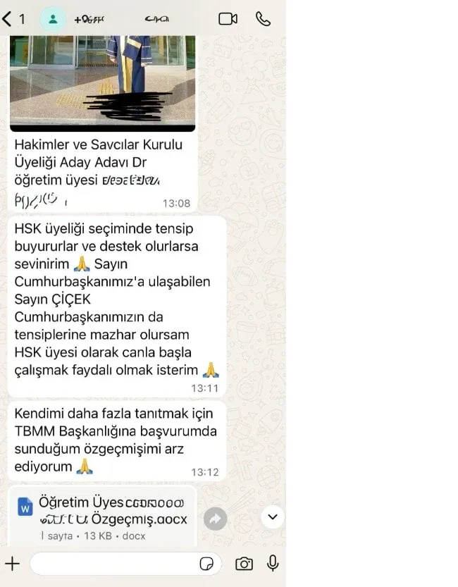 Akademisyenin gönderdiği WhatsaApp mesajında, eski Bakan Çiçek’ten HSK üyeliği için kendisine torpil yapılmasını istediği ifadeler yer aldı.