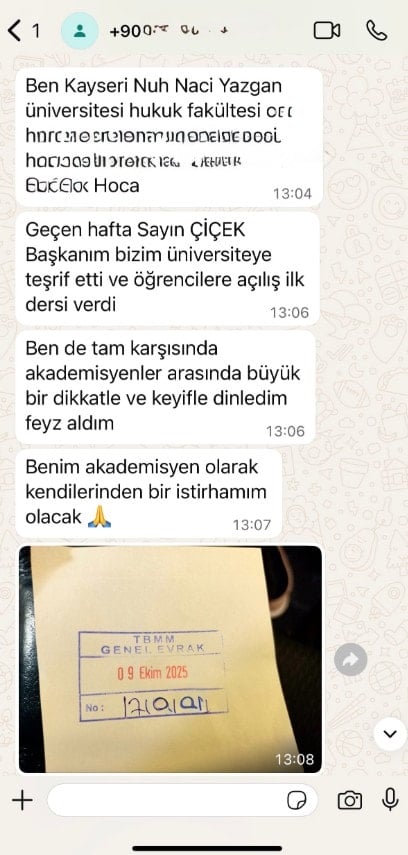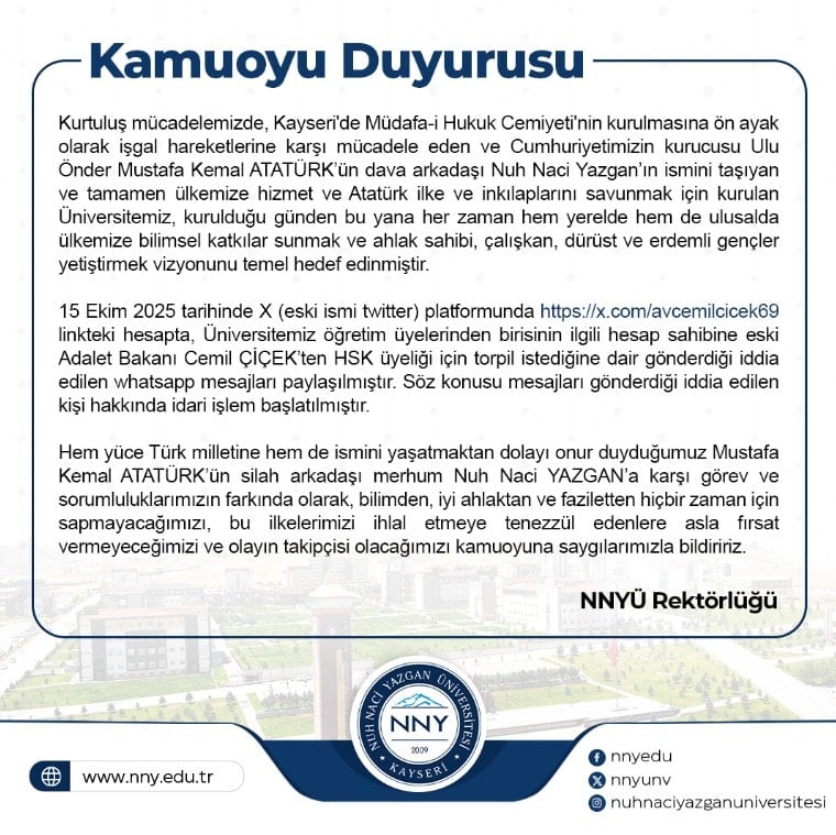 15 Ekim 2025 tarihinde X (eski ismi twitter) platformunda https://x.com/avcemilcicek69 linkteki hesapta, Üniversitemiz öğretim üyelerinden birisinin ilgili hesap sahibine eski Adalet Bakanı Cemil Çiçek’ten HSK üyeliği için torpil istediğine dair gönderdiği iddia edilen WhatsApp mesajları paylaşılmıştır. Söz konusu mesajları gönderdiği iddia edilen kişi hakkında idari işlem başlatılmıştır.