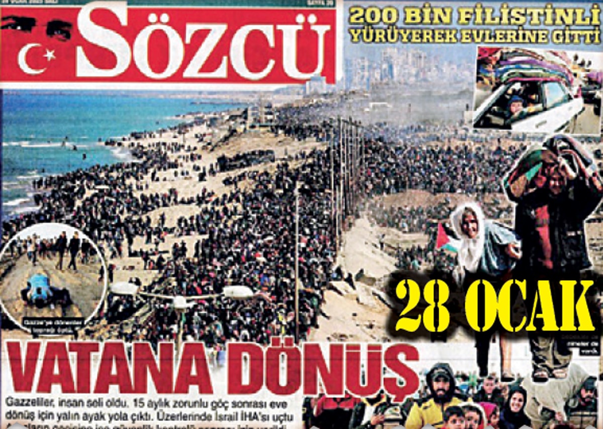 SÖZCÜ, Gazzelilerin geçen ocakta kentin kuzeyindeki evlerine dönüşünü böyle haber yaptı. Onlar şimdi hayatta kalmak için yeniden göç yolunda.