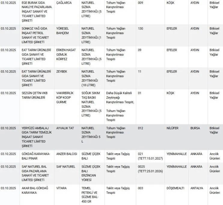 Kaynak:https://www.cumhuriyet.com.tr/turkiye/tarim-ve-orman-bakanligi-et-zeytinyagi-ve-balda-hileli-urun-satan-firmalari-acikladi-2440719