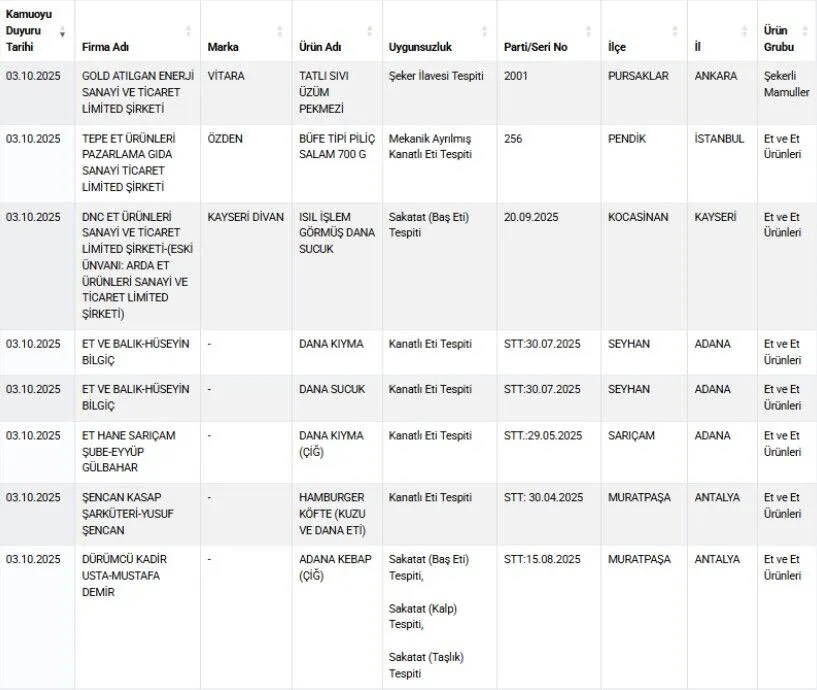 Tarım ve Orman Bakanlığı, 3 Ekim 2025 tarihinde yeni taklit veya tağşiş yapılan gıdaların listesini duyurdu.