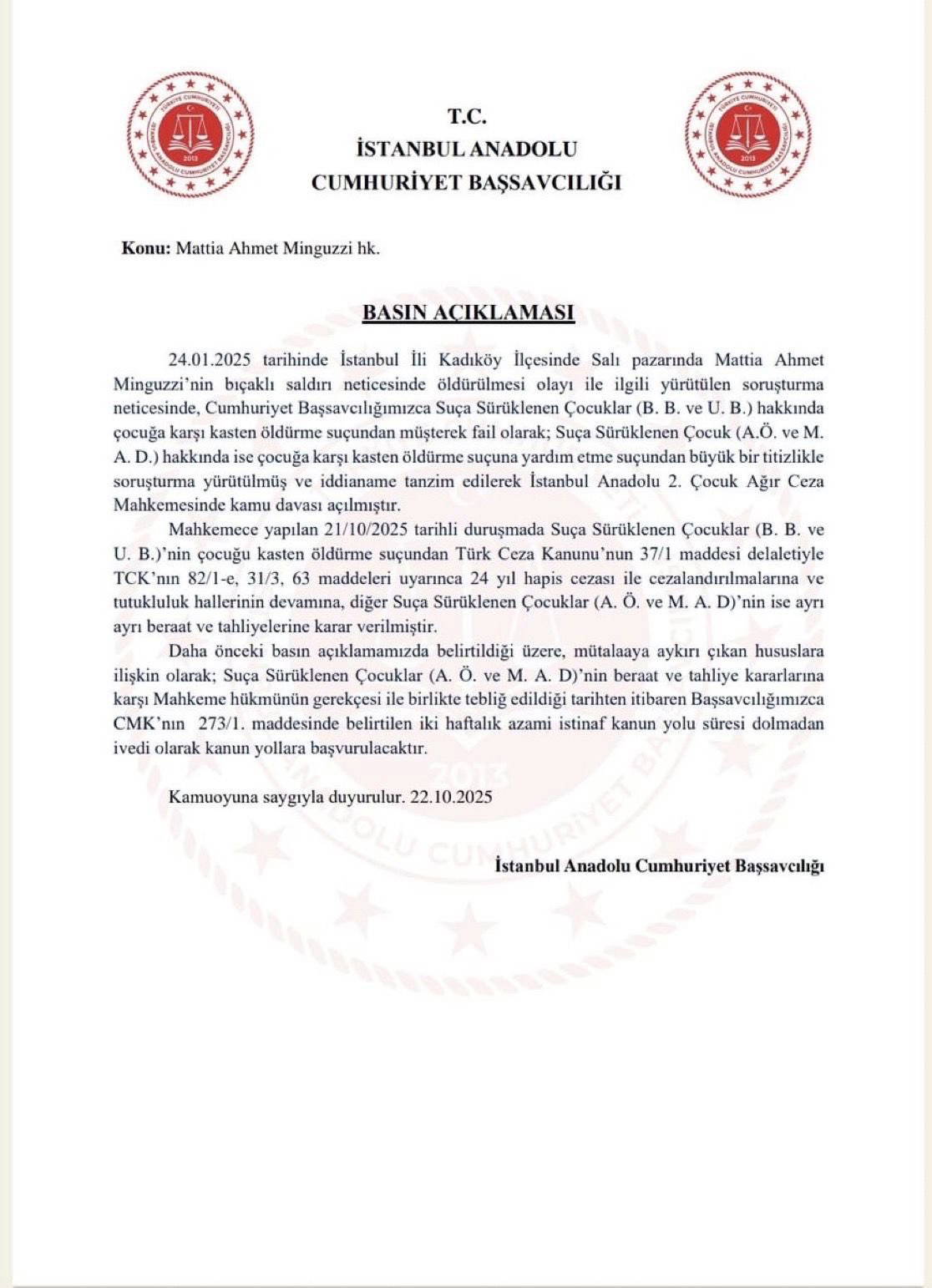 İstanbul Anadolu Cumhuriyet Başsavcılığı, Mattia Ahmet Minguzzi davasına ilişkin ikinci açıklamasını yaptı. Savcılık, beraat eden sanıklar A.Ö. ve M.A.D. hakkındaki kararların mütalaaya aykırı olduğunu vurguladı.