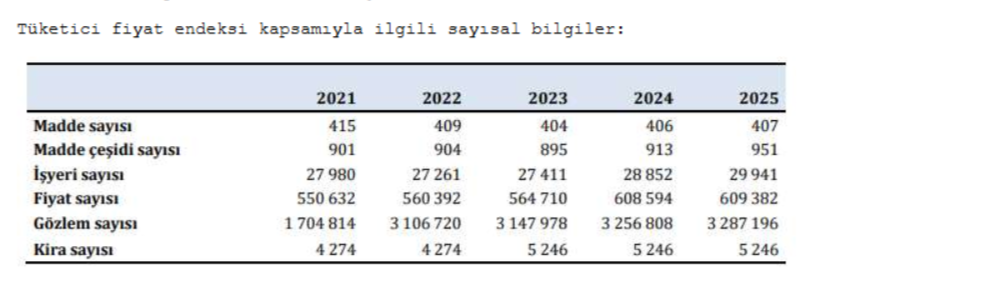 “Bu değişikliklerin sebebi, hanehalklarının madde çeşidi düzeyinde değişim gösteren güncel tüketim tercihlerinin de TÜFE sepetine yansıtılabilmesidir. Örneğin; “sigaralar (madde)” için yeni bir ürünün (madde çeşidi) piyasaya girmesi veya yaygın olarak tüketilir hale gelmesi durumunda madde sepetine ‘çeşit’ olarak eklenmesi gerekmektedir. Aynı durum otomobiller için de geçerlidir. Her yıl yeni modellerin piyasaya girmesi ve bazı modellerin üretimine son verilmesi nedeniyle “otomobil (dizel)” ve “otomobil (benzinli)” maddeleri için fiyatı derlenen marka ve modeller (madde çeşidi) güncellenmekte, ayrıca tüketicilerin zaman içinde değişen tercihleri de sepette yer alan madde çeşidi tanımlarına ve ağırlıklarına yansıtılmaktadır. Bu güncellemeler kapsamında örneğin, “temizlik ve bakım ürünleri” madde başlığı altında yüzey temizlik havlusu 2025 yılında ayrı bir madde çeşidi olarak TÜFE sepetine dahil edilmiştir.”