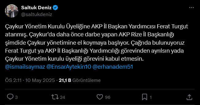 “Çaykur Yönetim Kurulu Üyeliğine AKP İl Başkan Yardımcısı Ferat Turgut atanmış. Çaykur’da daha önce darbe yapan AKP Rize İl Başkanlığı şimdide Çaykur yönetimine el koymaya başlıyor. Çağrıda bulunuyoruz Ferat Turgut ya AKP İl Başkanlığı Yardımcılığı görevinden ayrılsın yada Çaykur Yönetim kurulu üyeliği görevini kabul etmesin.”