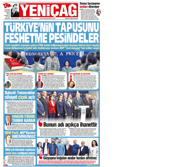 Yeniçağ Gazetesi’nin bugünkü manşeti… Gazetemizi okumak için tıklayınız… TÜRKİYE’NİN TAPUSUNU FESHETME PEŞİNDELER Terör örgütleri arasında sadece PKK ismini kullanmayacağını duyuran bölücü terör örgütü Lozan Antlaşması’nı hedef aldı. Açıklamaya …
