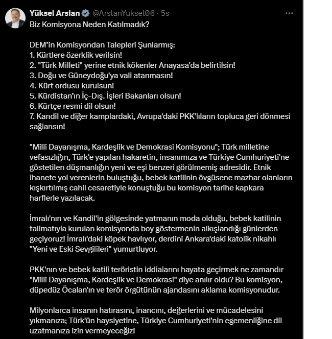 İYİ Parti Ankara Milletvekili Yüksel Aslan, sosyal medya hesabı üzerinden yaptığı “Biz Komisyona Neden Katılmadık?” başlıklı paylaşımla, DEM Parti’nin Komisyondan Kürtlere özerklik verilmesini istediğini iddia ederek partinin talep listesini yazmıştı.
